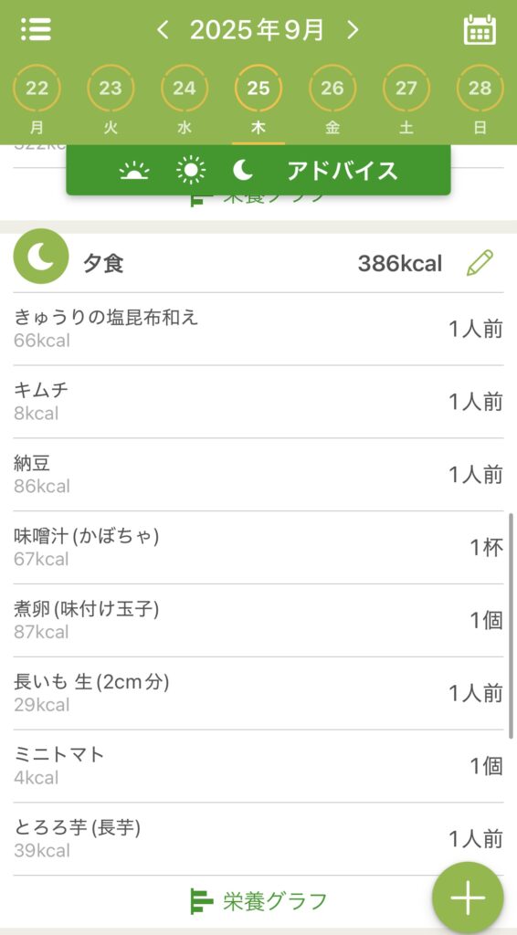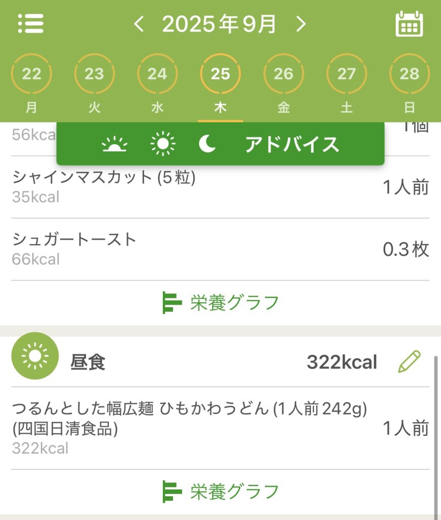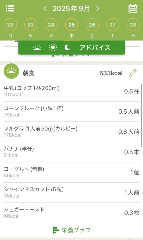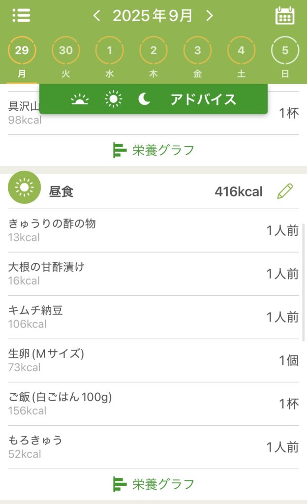 このスクショを見ると、どんな食事が目標カロリーに近いのかもイメージしやすくなります。