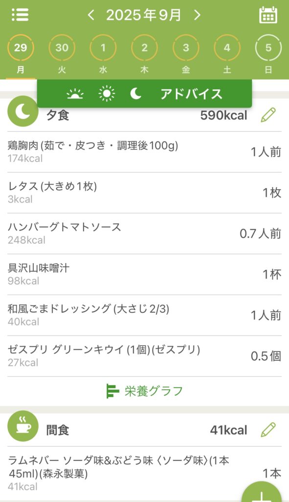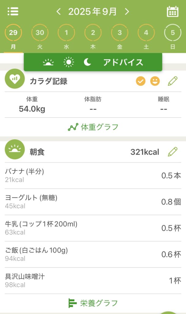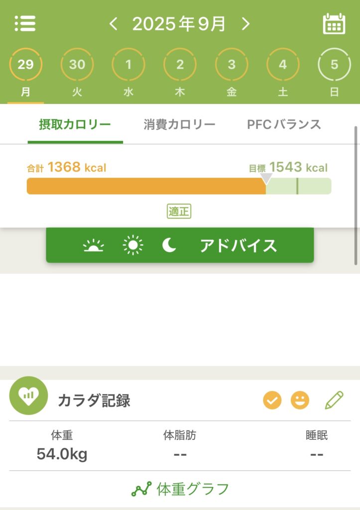 9月29日も夜ごはんに炭水化物を抜いて、間食にアイスを食べましたが摂取カロリーは適正内におさまりました♪