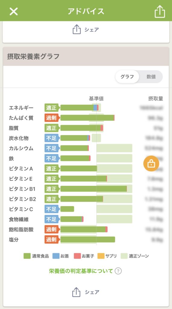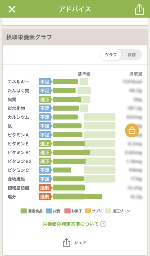 「たんぱく質が不足しています」「鉄分をもう少し摂りましょう」などのコメントが表示されます。