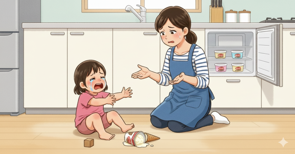 ママが洗濯物を干している間、立花ちゃんは「アイス食べたい!」とぐずり出します。
