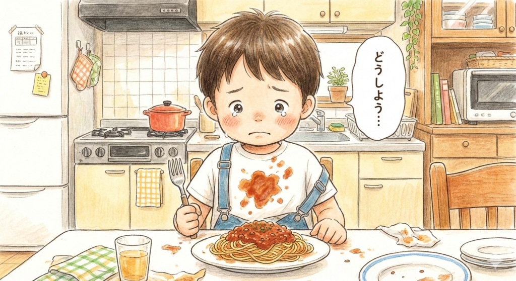 スパゲッティを食べていたところ、うっかり洋服にこぼしてしまい、