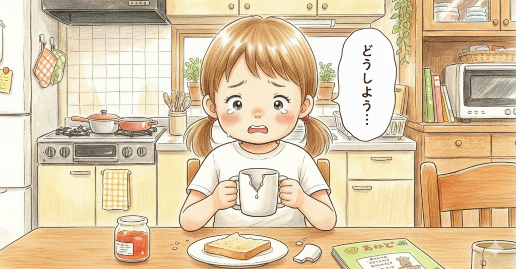 「どうしよう…」「ママに叱られるかも…」と大慌て。